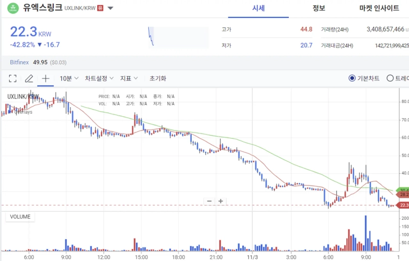 As of 11:11 AM KST on the 3rd, UXLINK is trading on Upbit at 22.3 won, down 42.82% from the previous day.