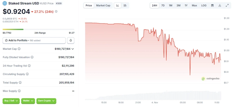 As of 11:43 AM that day, according to CoinGecko, XUSD is trading at $0.9204, down 27.2% from the previous day.