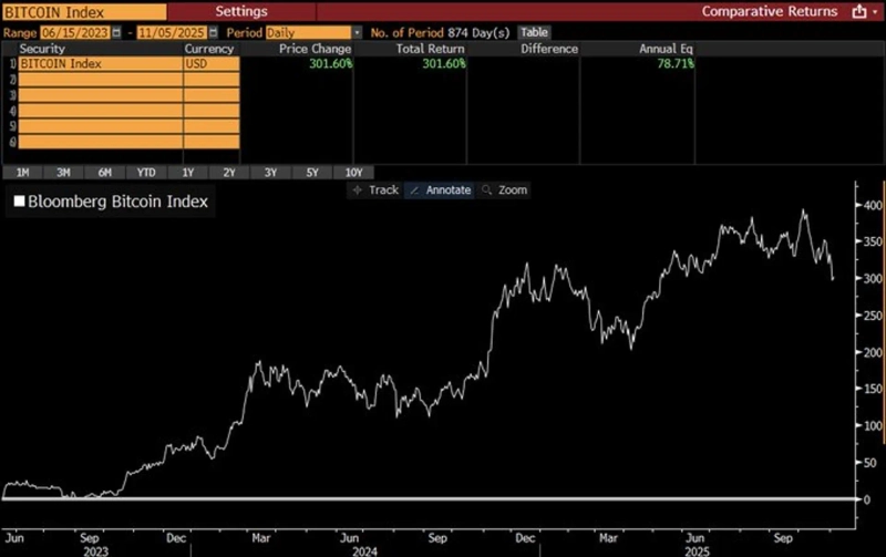 On the 5th (Korean time), Eric Balchunas, a Bloomberg ETF analyst, wrote on X (formerly Twitter), "Bitcoin has recently fallen, but compared to the time last year when ETFs were launched, it is still up 300%," adding, "The annual gain also reaches 80%. Calm down."