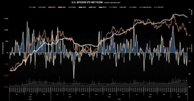 On that day, BlackRock's IBIT saw 374,440,000 dollars withdrawn, leading the overall outflows. By contrast, Fidelity's FBTC had inflows of 113,300,000 dollars, Ark Invest's ARKB 82,940,000 dollars, Bitwise's BITB 16,970,000 dollars, VanEck's HODL 3,680,000 dollars, and Grayscale's Mini BTC had inflows of 21,610,000 dollars. The other products had no net inflows or outflows.