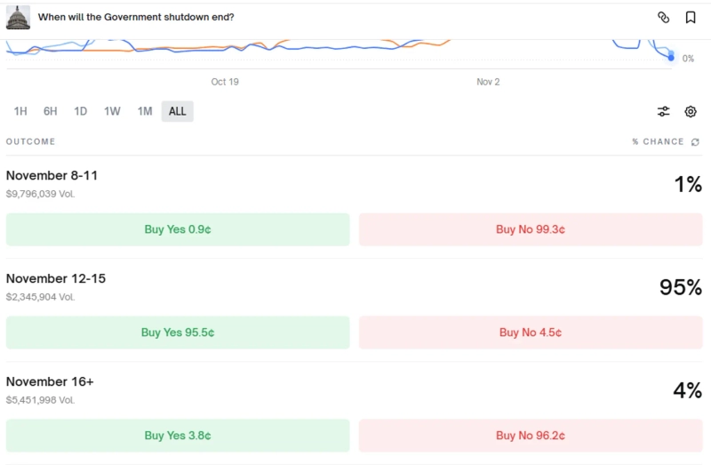 On the 11th (local time), Polymarket's 'When will the shutdown end' betting showed a 95% probability of the government resuming between November 12 and 15. A similar trend continues on another decentralized prediction market, Kalshi.