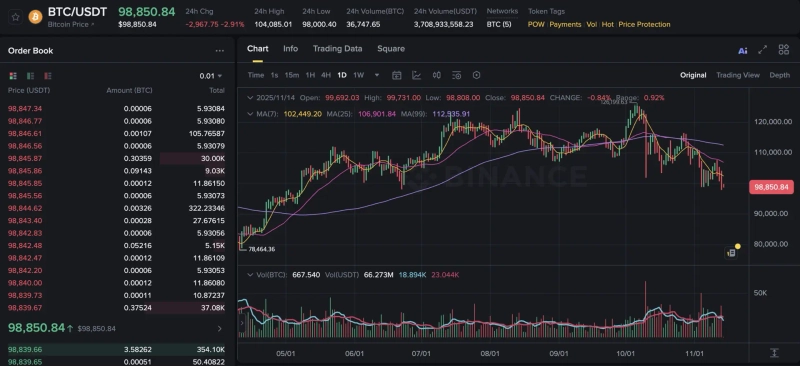 BreakingBitcoin (BTC), falls below $99,000Published 7:18 PM Nov 13, 2025Doohyun Hwang 00Copy linkTelegramXPhoto=BinanceBTCDoohyun Hwangcow5361@bloomingbit.ioKEEP CALM AND HODL🍀