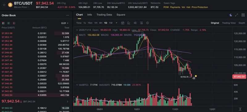 BreakingBitcoin breaks below 98,000 dollars...downtrend deepensPublished 11:36 PM Nov 13, 2025Doohyun Hwang 00Copy linkTelegramXBTCDoohyun Hwangcow5361@bloomingbit.ioKEEP CALM AND HODL🍀