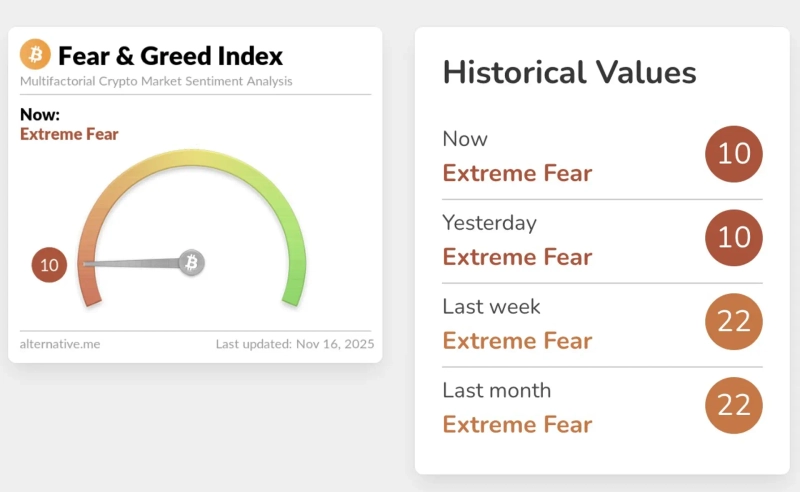 On the 15th (local time), the virtual asset fear and greed index from virtual asset analytics firm Alternative registered 10, remaining at the same level as the previous day (10). The weekly average also stood at just 22, leaving overall sentiment frozen. The fear and greed index ranges from 0 to 100, with lower values indicating 'Extreme Fear' and higher values indicating 'Greed'.