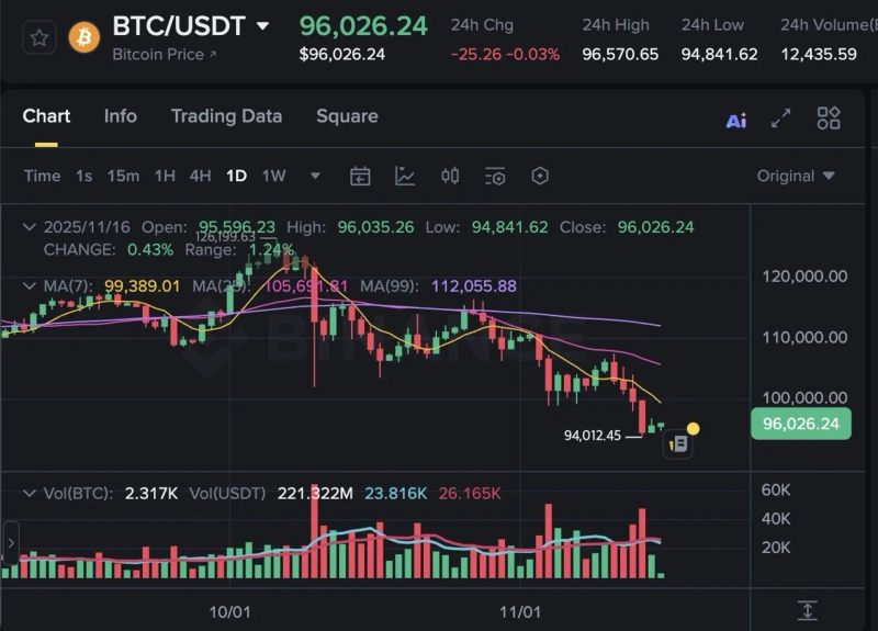 BreakingBitcoin (BTC), exceeds 96,000 dollarsPublished 12:13 AM Nov 16, 2025SourceDoohyun Hwang 00Copy linkTelegramXPhoto=BinanceBTCDoohyun Hwangcow5361@bloomingbit.ioKEEP CALM AND HODL🍀
