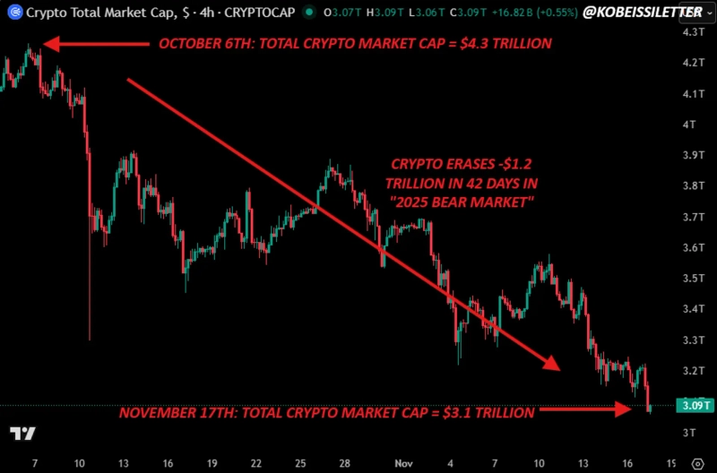 On the 18th (local time), Kobeishi Letter reported that over 42 days since October 6, crypto asset market capitalization decreased by about $1.2 trillion, erasing 28% of the total value.