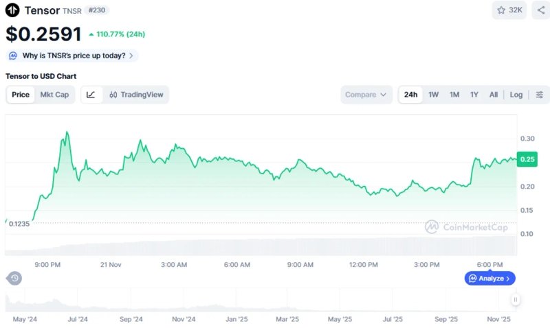 As of 7:19 PM KST on the 21st, Tensor is trading at 0.2591 dollars, up 110.77% from the previous day according to CoinMarketCap.