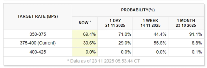 - CME FedWatch reported that the probability of a December rate cut was 69.4%.