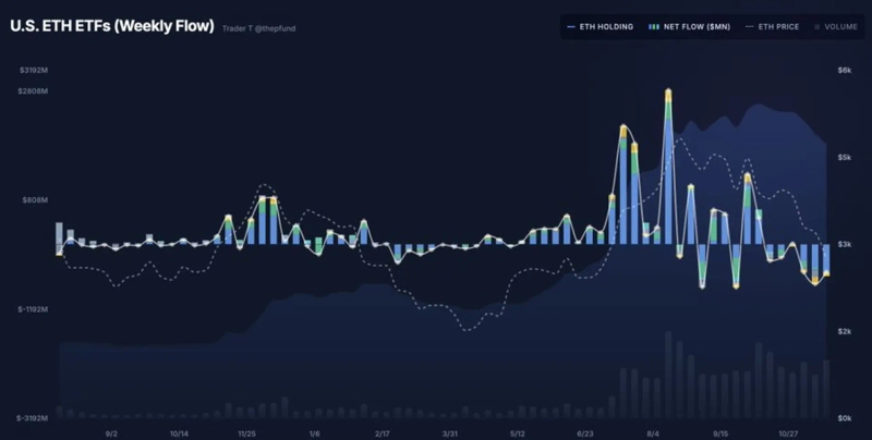 In Ethereum spot ETFs, BlackRock's ETHA recorded the largest net outflow, with $562,000,000 withdrawn. Meanwhile, Grayscale's ETHE saw net inflows of $49,000,000 and Bitwise's ETHW recorded net inflows of $14,000,000, indicating some capital re-entry. The weekly ETH ETF trading volume was around $12,000,000,000, and the most actively traded price level was $2,741.