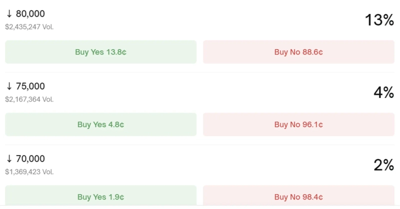 Polymarket "Bitcoin, 13% chance of falling below $80,000 in November"… significantly lower than last week