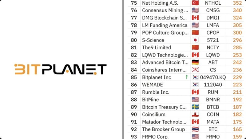 - As a result, BitPlanet ranked 85th in Bitcoin holdings among listed companies worldwide.