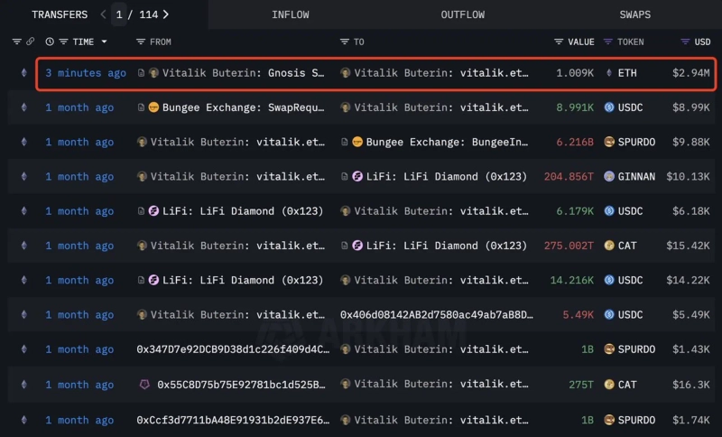 On the 26th (Korean time), according to LookonChain, 1009 Ethereum were withdrawn from the wallet of Vitalik Buterin, the founder of Ethereum (ETH).