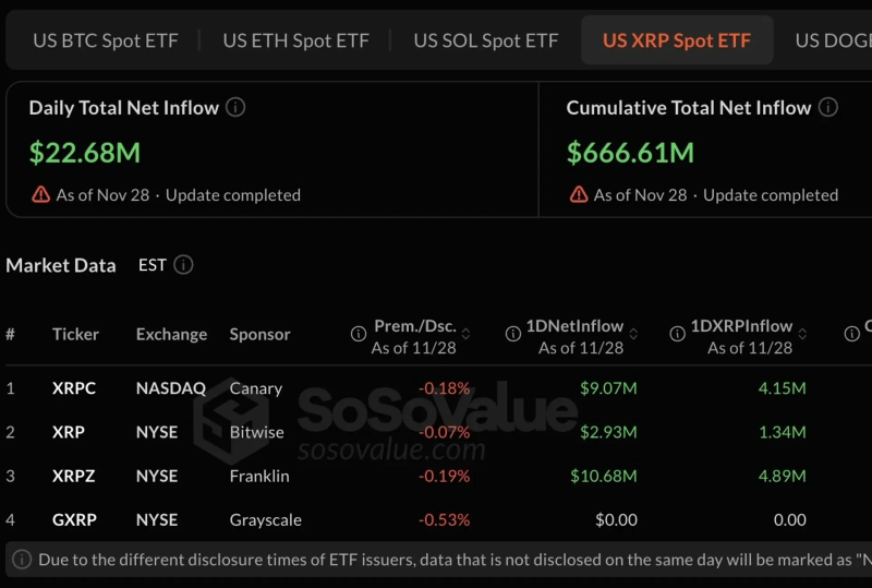 According to SosoValue's data, total net inflows into XRP spot ETFs that day amounted to $22.68 million. Among them, Franklin's 'XRPZ' attracted the most funds with $10.68 million. XRPZ's cumulative net inflows reached $85.22 million.