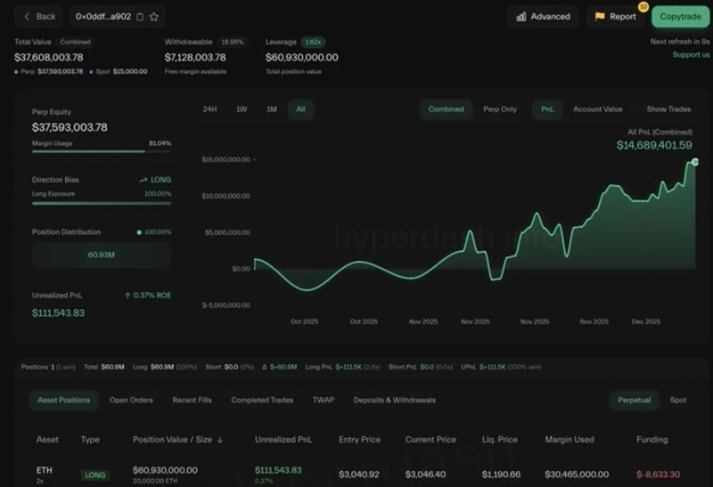 On the 7th (KST), according to LookonChain, a whale bought a 2x long position of 20,000 ETH at 3040.92 dollars.