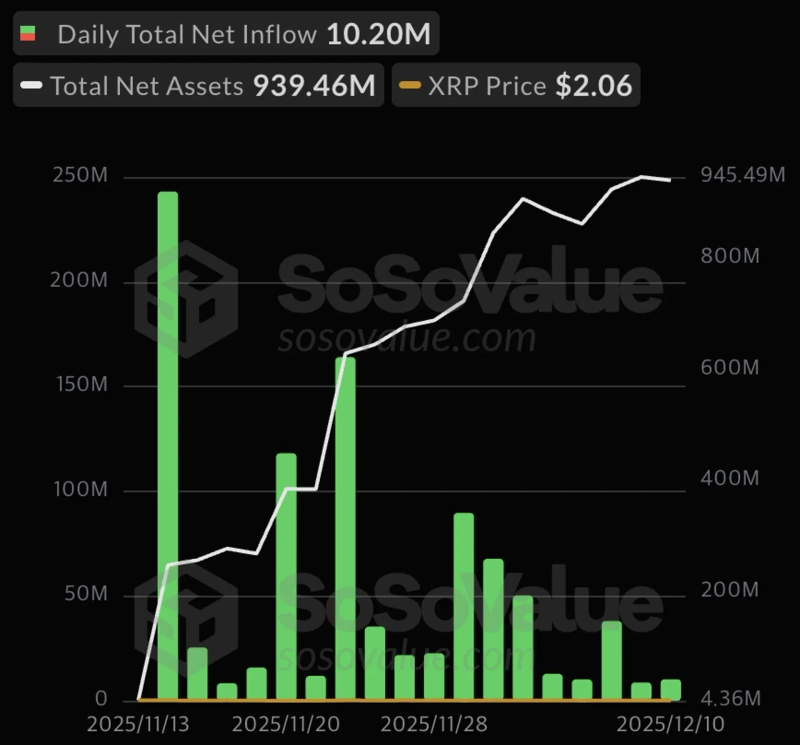 On the 11th (KST), crypto data analytics firm SoSoValue reported that the U.S. XRP spot ETF recorded 18 consecutive trading days of net inflows as of that day. The XRP spot ETF, which launched on the 14th of last month, has not posted a single day of net outflows. Cumulative net inflows were USD 954 million (about ₩1.4 trillion) as of that day.