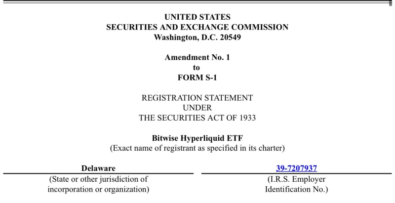 On the 15th, Eric Balchunas, a Bloomberg senior ETF analyst, wrote on X (formerly Twitter), "Bitwise has filed an amendment for the Hyperliquid ETF," adding, "The filing added an '8a' related item along with the fee rate (annual 0.67%) and the ticker 'BHYP'."