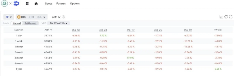 Over the past month, implied volatility for major expiry options of Bitcoin (BTC) has fallen by more than 5% overall, and by over 10% in the short- and mid-term segments. The decline in Ethereum (ETH) volatility was said to be even greater.