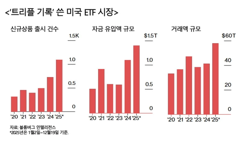 On the 25th, Bloomberg Intelligence reported that through the 19th of this year, U.S.-listed ETFs set record highs in fund inflows, number of new products, and trading volume, respectively. It is the first time since 2021 — when global liquidity surged due to the impact of COVID-19 and triggered an "investment boom" — that the three indicators simultaneously reached all-time highs in a single year.