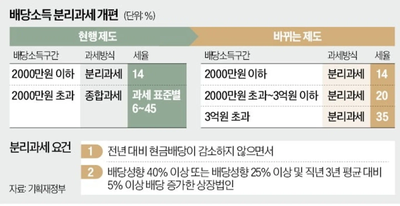 First, separate taxation on dividend income will be introduced from next year to encourage high dividend payouts. This system taxes investors' dividend income separately from labor and interest income at lower rates.