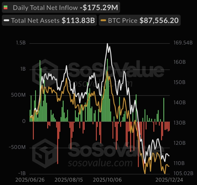 According to SosoValue on the 25th (local time), U.S. spot Bitcoin ETFs saw net outflows of $175.3 million (about 250 billion won) on the previous day (24th). This marks five consecutive trading days of net outflows. So far this month, spot Bitcoin ETFs have seen $843 million (about 1.22 trillion won) in outflows.