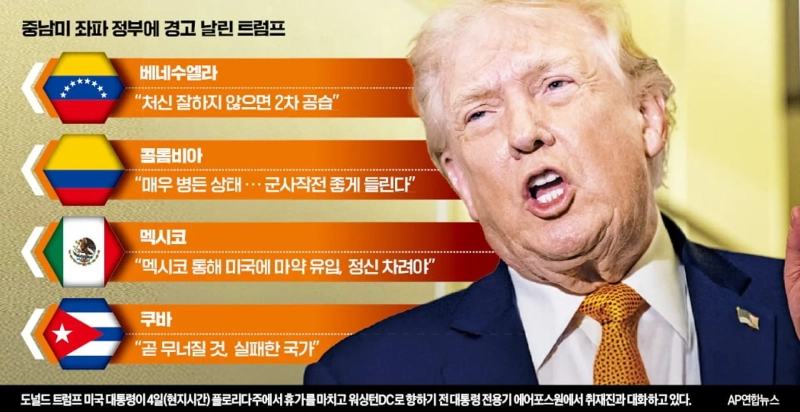 On the 4th (local time), aboard his plane returning to Washington, D.C., President Trump responded "seems like a good idea" when asked whether "the United States would actually pursue a military operation against Colombia." This was interpreted as not ruling out the possibility of airstrikes on Colombia. President Trump said, "Colombia is a very sick country," and accused its leader, "a disgusting man who likes to make cocaine and sell it to the United States (Gustavo Petro, the president of Colombia)," adding that "he won't be able to do that for long."