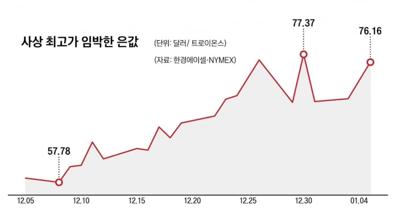 Silver also rose. On the same day at the New York Mercantile Exchange it was $76.16 per troy ounce, jumping $5.6 (7.94%) in one day. The silver high was $77.37 on the 30th of last month, about $1 higher than that day's price.