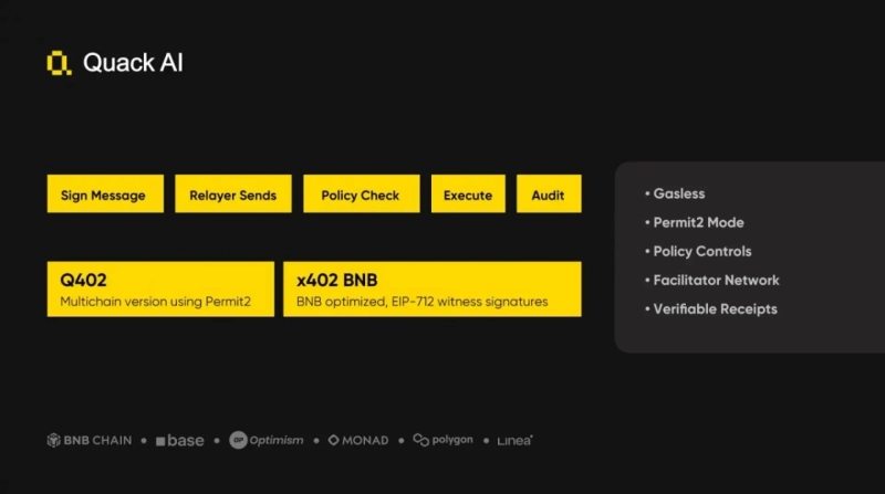 Quack AI has chosen a strategy of prioritizing real-world validation over rapid expansion. In this process, it is collaborating with Binance Chain (BNB) to operate x402 BNB as the first live implementation of the Q402 architecture.