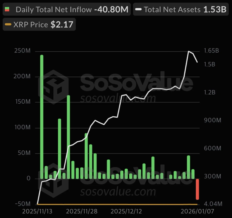- U.S. spot XRP ETFs saw a net outflow of $40.80 million, ending a 36-day streak of net inflows.