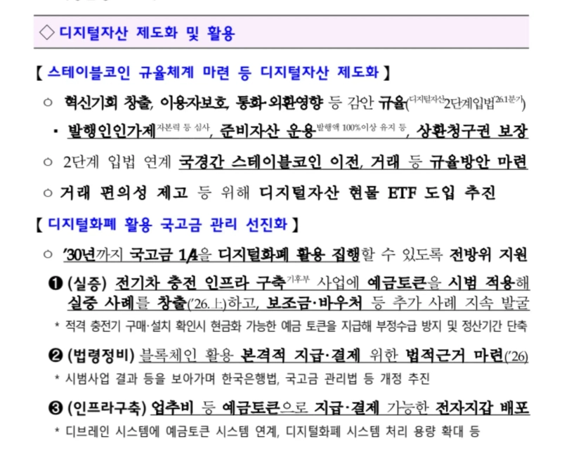 In tandem, it plans to institutionalize the stablecoin (fiat-pegged virtual asset) market by completing “phase-two digital-asset legislation” within the first quarter.