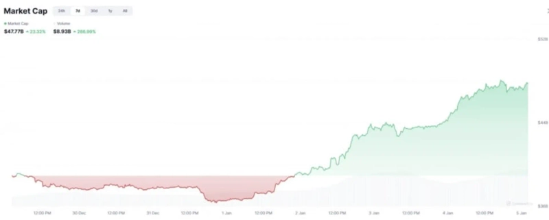 This appears to have been influenced by a rebound in the memecoin market, which drove Solana’s rally early last year. According to Cointelegraph, total memecoin market capitalization rose from about $38.0 billion on the 29th of last month to more than $47.7 billion on the 5th. That is an increase of more than 23% in just a week. Trading volume also jumped from $2.17 billion to $8.7 billion over the same period—nearly quadrupling. With Solana having been the ecosystem that saw the fastest inflows in such phases, the interpretation is that Solana benefited.