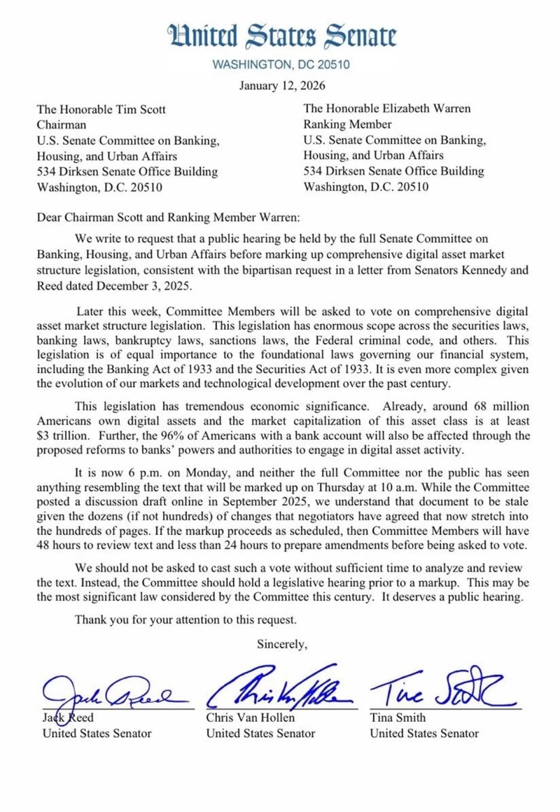 However, the three senators have previously taken a critical stance toward digital assets, fueling expectations that they are likely to vote against the legislation regardless of whether a hearing is held. Some in the market also interpret the move as focused more on questioning the legitimacy of the legislative process than on the substance of the bill.