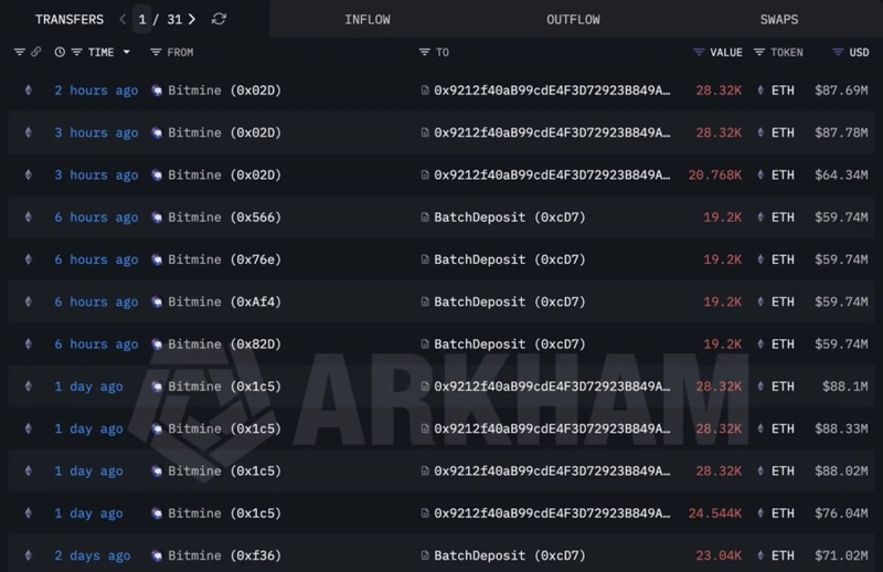 On the 13th (local time), Lookonchain said Bitmine, led by Tom Lee, staked an additional 154,208 Ethereum (ETH) over the past six hours. In value terms, this amounts to about $478.77 million.