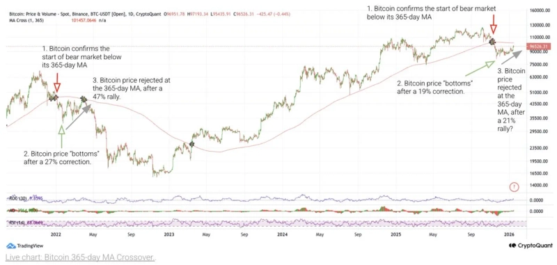In particular, concerns are growing that the current pattern resembles the 2022 downturn. CryptoQuant cautioned investors, noting that "in 2022, Bitcoin also broke below the 365-day moving average and then attempted a strong rebound, but it met resistance around that moving average and returned to a broader downtrend."