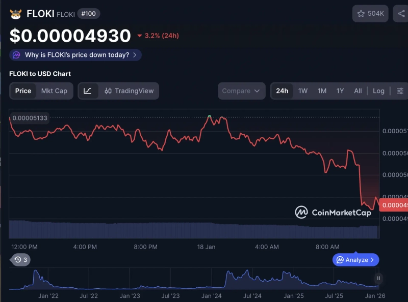 As of 11:20 a.m. this morning, Floki was trading at $0.00004930, down 3.2% from the previous day, according to CoinMarketCap.
