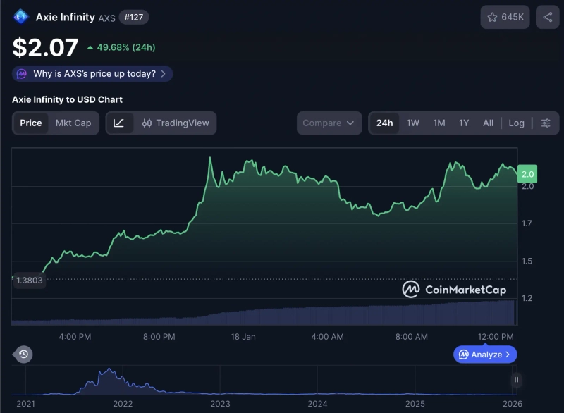 - Axie Infinity (AXS) was said to be trading at $2.07, up 49.68% from the previous day intraday.