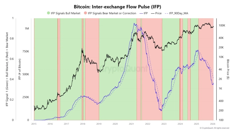 On the 20th, analyst CW8900 said in a CryptoQuant Quicktake report that "the ‘Inter-Exchange Flow Pulse (IFP)’ indicator, which shows Bitcoin’s inter-exchange fund flows, has turned upward after passing a low."