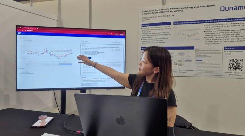 In the AAAI Demo Track, Hee-su Park, a researcher on Dunamu’s Machine Learning Team, presented the paper titled “Market-Aware Event Timeline Summarization: Integrating Price Signals to Improve Financial News Understanding,” and conducted a live demonstration of a system developed in-house by Dunamu.