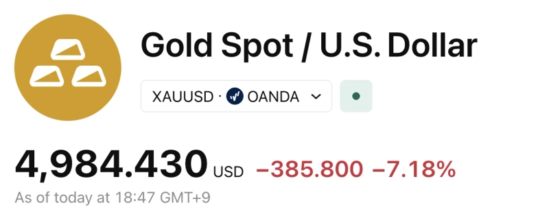Breaking[Breaking] Gold down 7% from the previous day…below $5,000 per ouncePublished 4:48 AM Jan 30, 2026Uk Jin 01Copy linkTelegramX XAUTUk Jinwook9629@bloomingbit.ioH3LLO, World! I am Uk Jin.