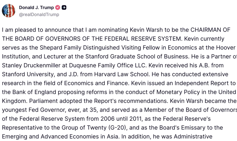 On the 30th (Korea time), Trump said on his Truth Social, "I am pleased to recommend Kevin Warsh as Fed chair."