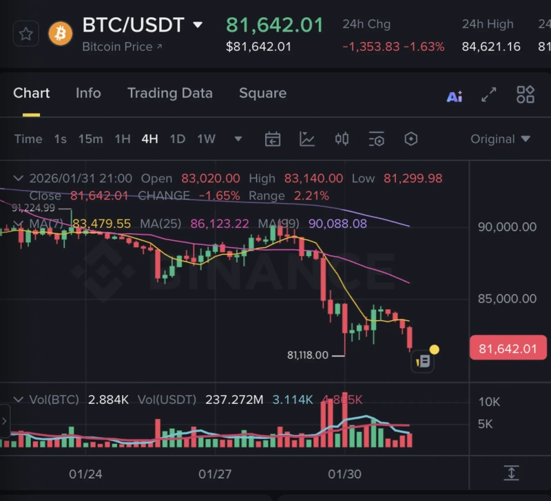 As of 11:30 p.m. KST on the 31st, Bitcoin was trading at $81,642 on Binance, down 1.63% from the previous day.