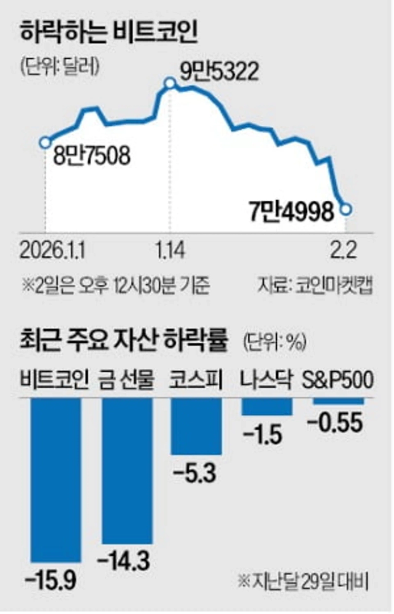 Bitcoin plunged nearly 5% in a single day, briefly breaking below the $75,000 mark. Global cryptocurrency market capitalization has evaporated by $250 billion (about 360 trillion won) over the past two days. On the surface, the move was driven by the so-called “Wash shock,” after Kevin Warsh, a former U.S. central bank (Fed) governor seen as hawkish (favoring monetary tightening), was named as the next Fed chair. However, as Bitcoin has also shown signs of decoupling from not only gold, a safe haven, but also equities, a risk asset, some interpret this as fueling doubts about Bitcoin’s value as an asset.