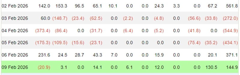 In contrast, BlackRock’s IBIT recorded $20.9 million in net outflows. Fidelity’s FBTC saw $3.1 million in net inflows, ARK Invest’s ARKB $14.1 million, while Franklin’s EZBC and VanEck’s HODL attracted $6.1 million and $12.0 million, respectively. The remaining products saw no net flows.