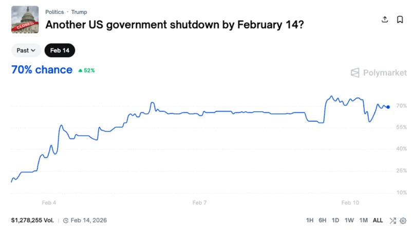 According to BlockBeats, a cryptocurrency-focused media outlet, assessments suggest the risk of another shutdown is growing as Democrats and Republicans have failed to narrow their differences over an overhaul of the Trump administration’s immigration enforcement policy. The US previously endured a 43-day federal government shutdown last fall, and as recently as just a week ago experienced a four-day short-term shutdown.