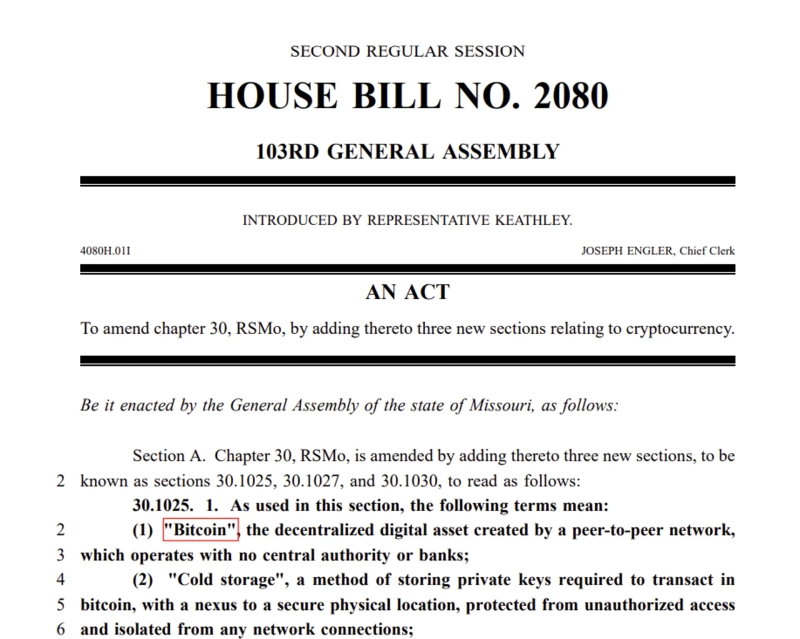 On the 21st (KST), Bitcoin.com News reported on X (formerly Twitter) that “the Missouri Legislature has referred House Bill 2080 (HB 2080) to the House Commerce Committee.”