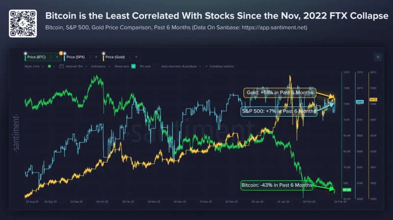 With internal flows weakening, correlations with traditional financial assets have also visibly declined. On-chain analytics firm Santiment said that “since late August last year, gold has risen 51% and the S&P 500 has gained 7%, but bitcoin has fallen 43%,” adding that “this is the lowest correlation level since late 2022.” It added that “in the past, after correlations fell sharply, there were cases where bitcoin re-tracked equity moves and shifted into a rebound phase.” This is interpreted as suggesting the possibility of a rebalancing of flows after a short-term divergence.
