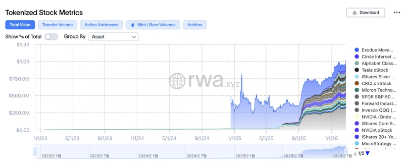 According to blockchain data analytics firm RWAxyz on the 26th, tokenized stocks’ market cap stood at about $1.02 billion as of that day. This marks a 4.84% increase from a month earlier, and is the first time the figure has topped $1 billion.