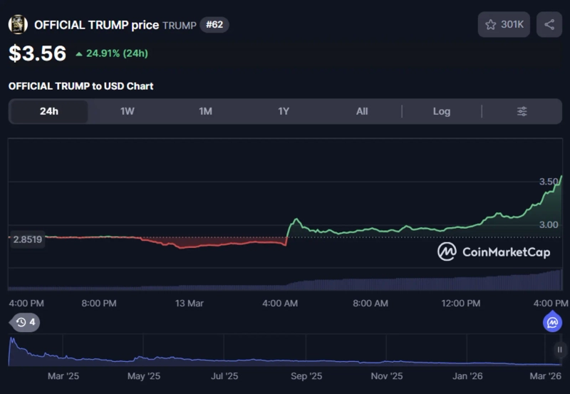 As of 4:20 p.m. KST on the 13th, Official Trump was trading at $3.56 on CoinMarketCap, up 24.91% from the previous day.