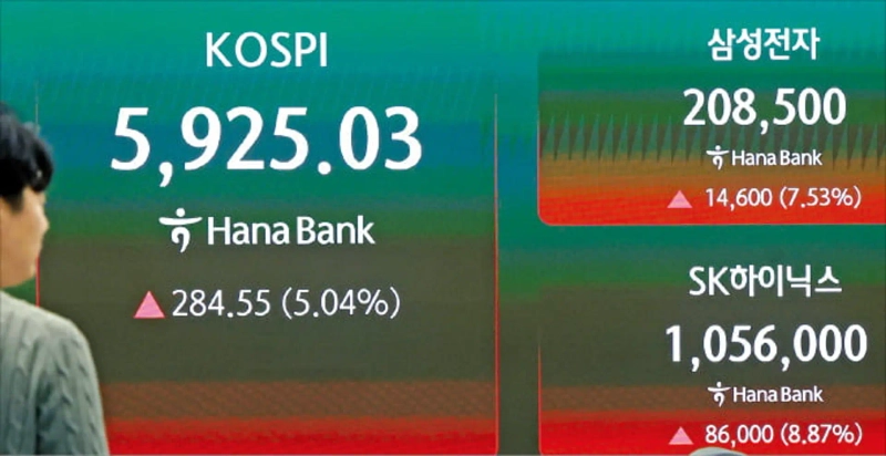Semiconductor bellwethers such as Samsung Electronics and SK Hynix surged. Samsung Electronics rose 7.53% to close at ₩208,500, and SK Hynix jumped 8.87% to ₩1,056,000, returning to the “200,000-won Samsung” and “1,000,000-won Hynix” milestones. Their combined share of total market capitalization on the KOSPI was tallied at 40.61%, exceeding 40% for the first time on record.