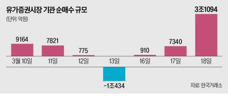 The day’s rally was led by institutions. Institutional investors posted net purchases of ₩3.1094tn on the main board, the largest on record, topping the previous peak of ₩2.7123tn set on Feb. 9.