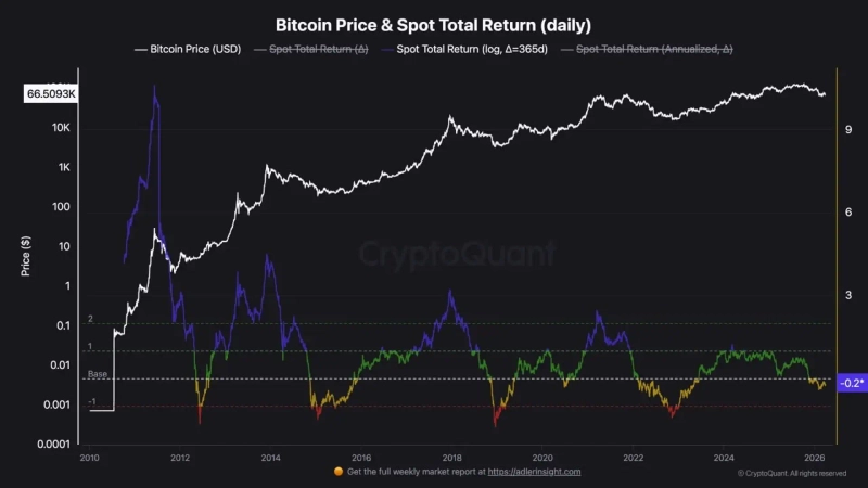 On the 30th (local time), Zizcrypto reported that Bitcoin’s spot total return indicator has, following the recent price correction, shown holding-period returns gradually converging toward neutral levels. The indicator measures price-based returns over a given period, illustrating changes in profitability across market regimes.